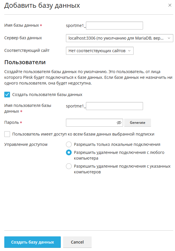 - Пароль — пароль жазыңыз немесе generate батырмасы арқылы автоматты түрде қойыңыз және сақтап алыңыз.
