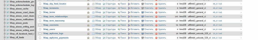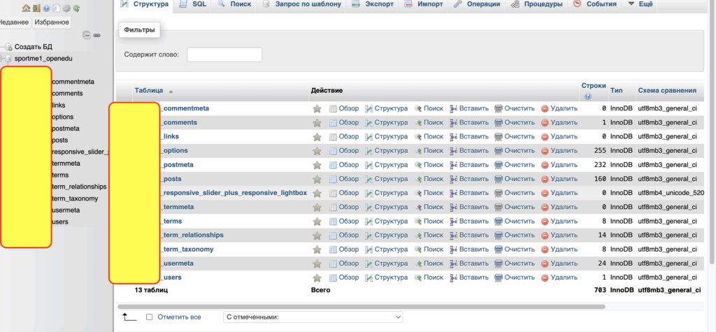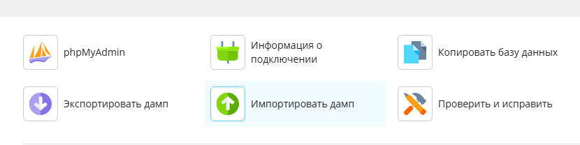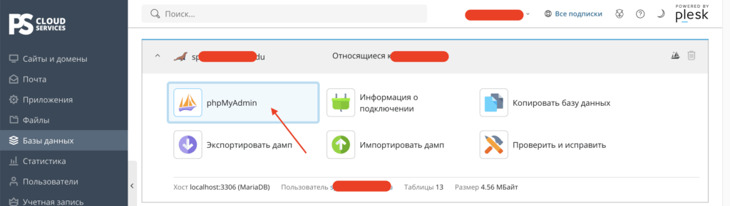 Баскару панелі — базы данных бөліміндегі қажетті деректер қорының үстіне басып, phpMyAdmin бөліміне өтіңіз: