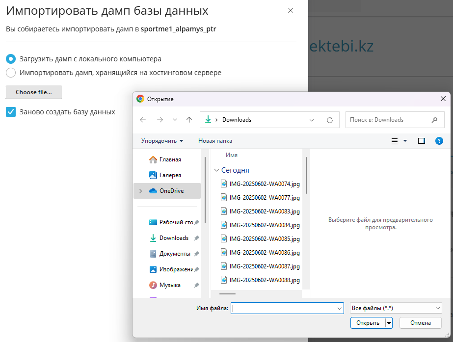 Choose file… батырмасын басып, sql форматындағы деректер қорын таңдаңыз және импортировать дамп батырмасын басыңыз. осымен сіз деректер қорын деректер базасына енгіздіңіз, келесіде осы деректер қоры мен сайтты байланыстыратын боламыз.