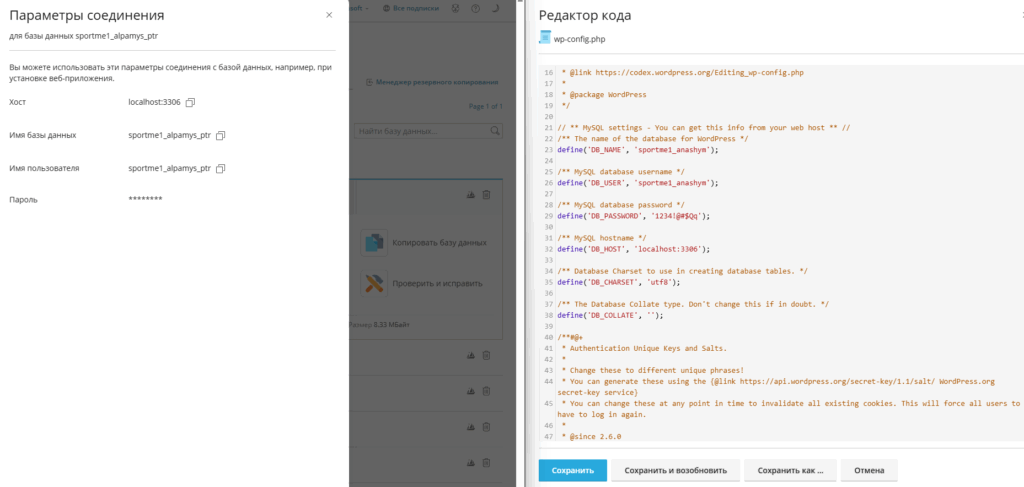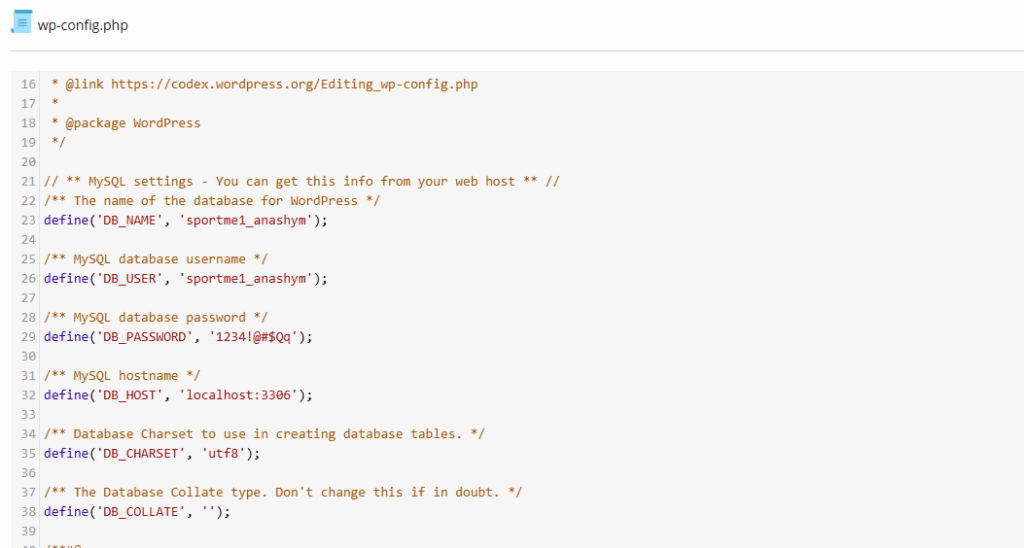 Негізінен wp-config.php мен деректер қорын браузерде паралель екі терезеде ашып алған абзал, өйткені деректер базасынан қажетті деректерді wp-config.php файлының қажетті жеріне қойғанға жеңіл. мысалы төмендегі суреттегідей: