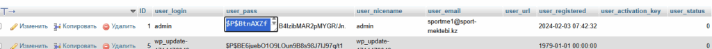 users таблицасын ашыңыз да көшіріп алған хеш парольді user_pass деген өрістің үстіне екі рет шертіп, ерекшелеп өшіріп тастап, өзіңіздің хеш парольді қойыңыз. Бұл сіздің шифрланған пароліңіз. Ал логиныңыз user_login өрісінде көрсетілген логин: