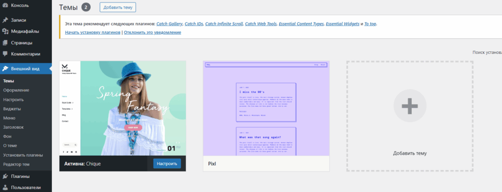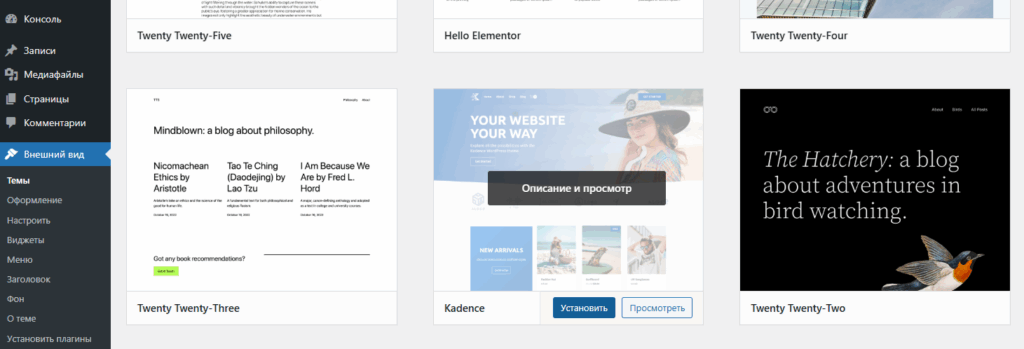 Консольда Внешний вид — темы сілтемесі арқылы сайтымызға әртүрлі темаларды орната алмыз: