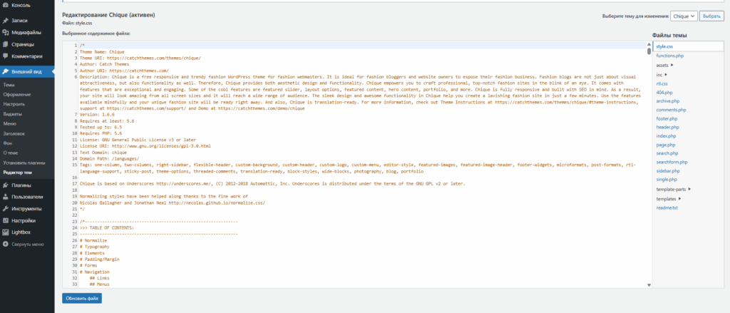Бұл жерде тема файлдары оң жақта ал, сол файлдың үстіне бассақ сол жақтағы терезеге файл коды шығады, осы жерге біз қажетті код жазып, обновить файл батырмасы арқылы сақтай аламыз.