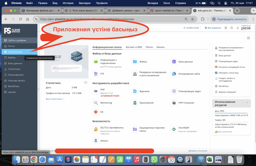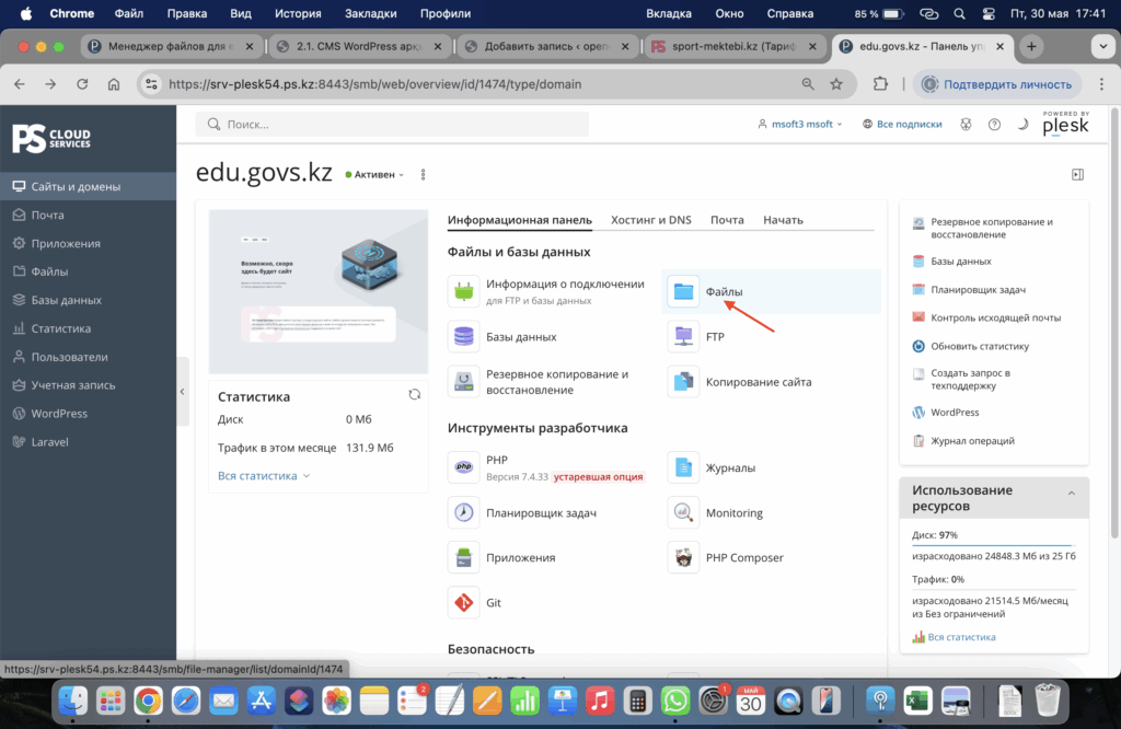 Мысалы, сіз белгілі бір сайтты сүйемелдеуге алдыңыз, сіздің электронды поштаңызға zip типіндегі архив пен sql типіндегі деректер базасын жіберді. Алдымен ps.kz басқару тақтасына өтіңіз ары қарай файлы белгішесіне өтіңіз: