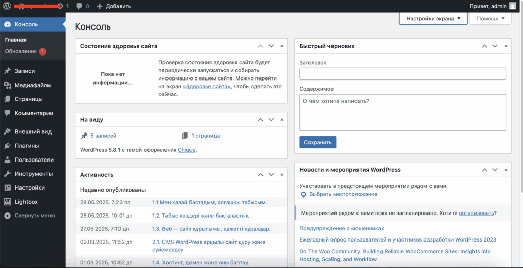Осылайша сіз сайтыңыздың әкімшілік бөлігіне кіретін логин мен парольді анықтадыңыз, ендігі кезекте браузерде домен атауынан https://menin-saitym.kz кейін wp-admin жұрнағын жалғап сайттың әкімшілік тақтасына қол жеткізе аласыз, ары қара осы сабақ басында жазылғандай записьтер мен беттерді, мәзір мен виджеттерді және сайттың жалпы баптауларын өзгертіп, сүйемелдер отырасыз! келесі сабақтарда қажетті плагиндерді осы сайттың әкімшілік консольі арқылы орнатып баптауды үйренеміз.