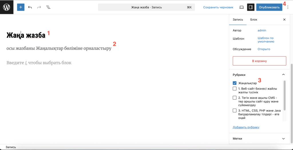 - 3-Рубрикалар, мысалда жаңалықтар рубрикасына жазба қосу