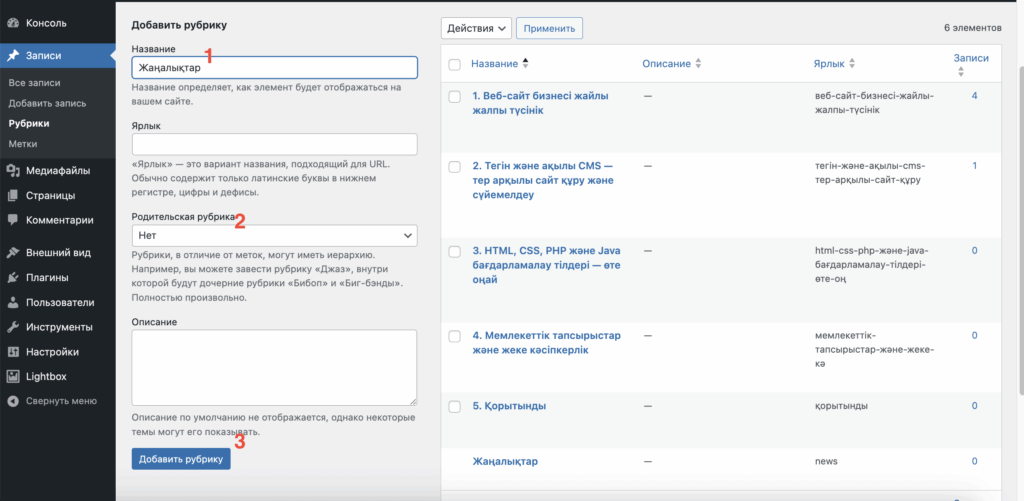 - 1-Название — жаңадан құратын рубрика атын жазу, мысалы жаңалықтар