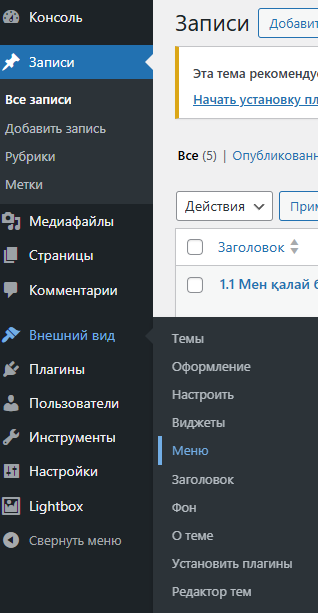 - Сайт мәзірін: Внешний вид — Меню сілтемесі арқылы ашамыз.