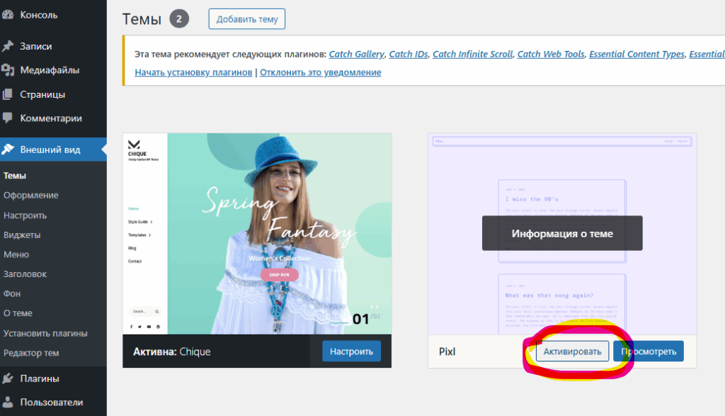 - Внешний вид — Темы сілтемесін басып, орнатылған тема үстіндегі — Активировать батырмасын басу арқылы теманы белсенді ете аламыз.