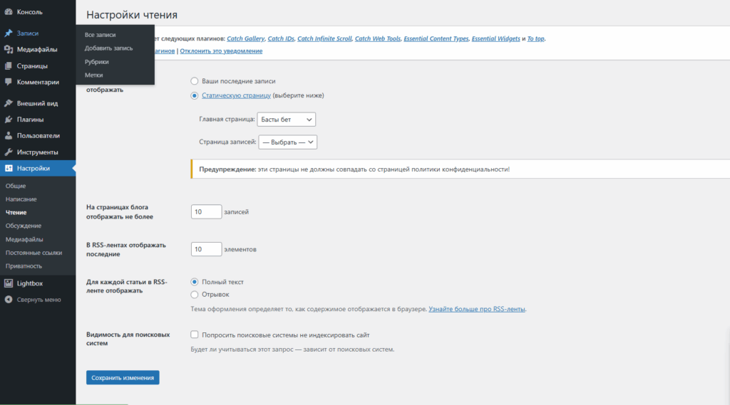 Записи [Жазбалар] — Әр түрлі мәтін, сурет, видео және блоктар құрып, оны рубрикаларға орналастыруға арналған кішігірім жүйе. Мысалы жаңалықтар рубрикасы. Осы записи мәзірі ішінде Все записи, Добавить запись, Рубрики және Метки орналасқан.