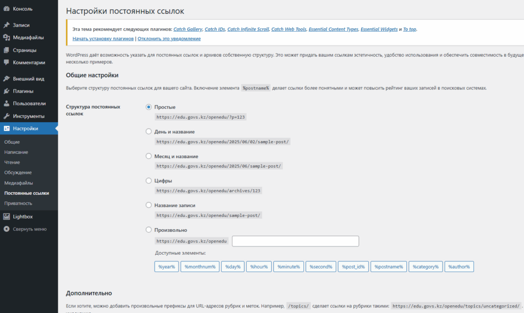 Сайттың жалпы баптаулары, сайт мекен-жайы, сайтты талқылау баптауы, медиафайлдар баптауы және тұрақты сілтемелер баптауы. Осымен біз жүйені толық орнату, баптауды үйрендік, толықтырулар мен қосымша баптауларды https://ru.wordpress.org/ сайтынан көрсеңіздер болады.