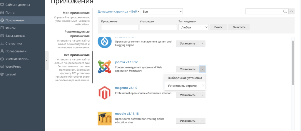 Хостинг панелі арқылы орнату үшін хостинг мәзірің Приложения — все приложения-веб joomla v x.x. таңдап қажетті баптауларын жасап орната аламыз.