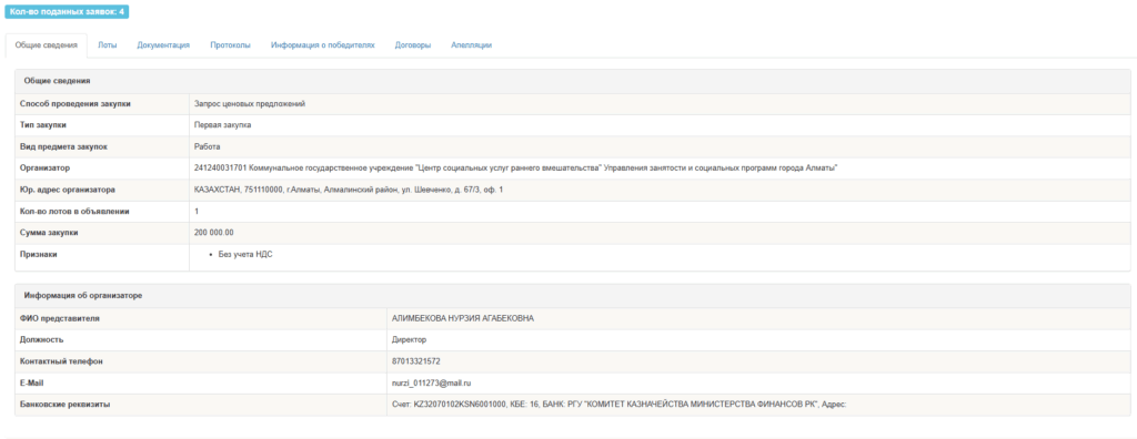 «Информация о победителях» — жеңімпаз болған тапсырыс орындаушы жеке кәсіпкер немесе компания.