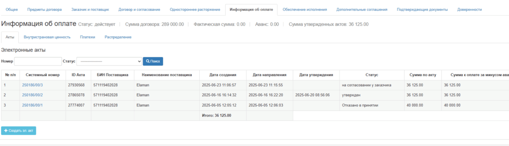 Шарттың «Информация об оплате» деген бөлігіне өтіп, «создать акт» басыңыз. ары қарай жалпы соманы әр айға бөліп, «добавить услугу» арқылы электронды акт жасаңыз.