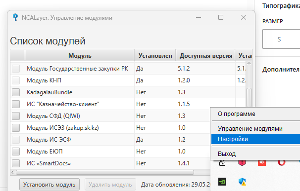 ЕСКЕРТУ! сіздің компьютеріңізде төмендегідей NCAlayer бағдарламасы қосылып, «Модуль Государственные закупки», «Модуль КНП» және «Модуль ИС ЭСФ» модульдері орнатылып тұруы тиіс.