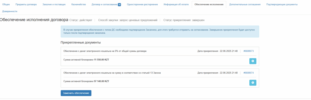 Келісім-шарт жасалып болған соң, 10 күнтізбелік күн ішінде сіз келісім-шарттың «обеспечение исполнение» бөліміне өтіп, қанша суммаға бағаны түсірдіңіз және кепілдік сомасын қосып, өзіңіздің электронды әмияныңыздан немесе банк кепілдігі арқылы қаражат бекітуіңіз қажет. бекітілмеген жағдайда сізді автоматты түрде қара тізімге яғни жауапсыз орындаушы ретінде тіркеуі мүмкін. Ондай жағдайда сіз 2 жыл тендерге қатыса алмайсыз!
