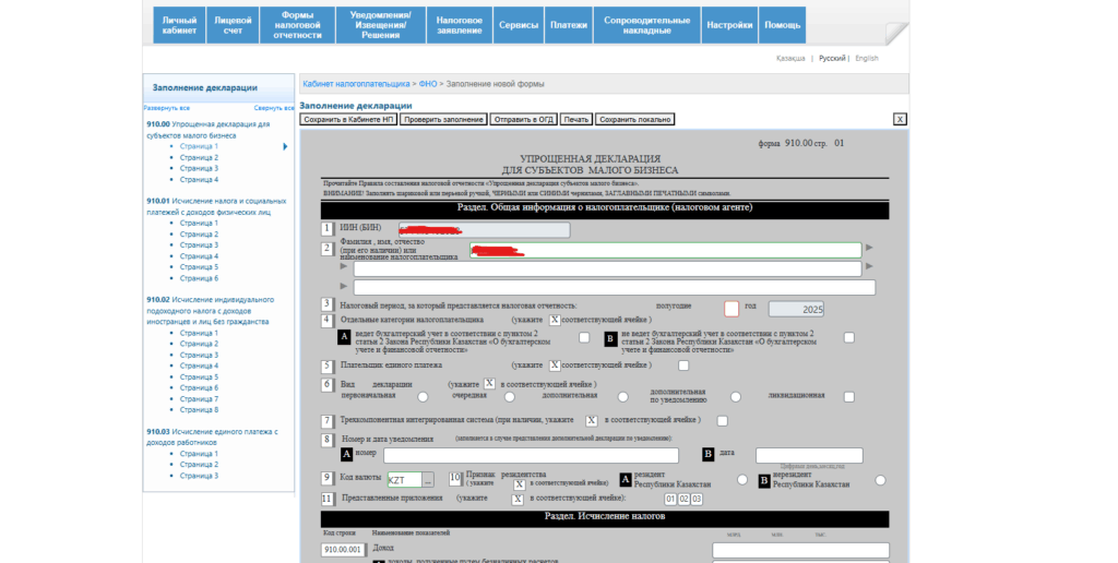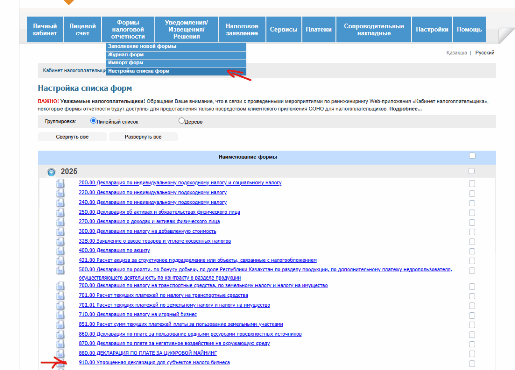 Настройка списка форм — 910.00 Упрошенная декларация для субъектов малого бизнеса өтіңіз.