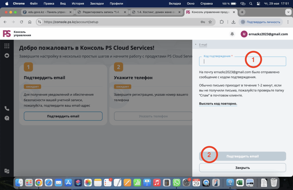 - 1 — электронды пошаңызға келген кодты енгізіңіз