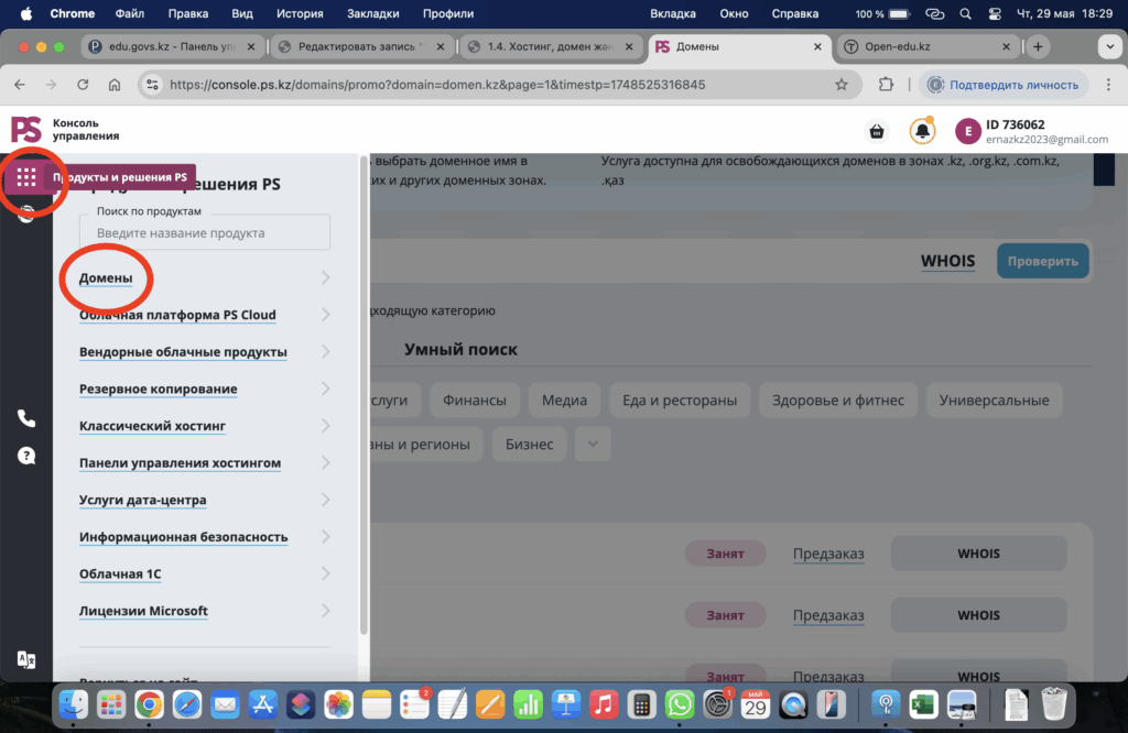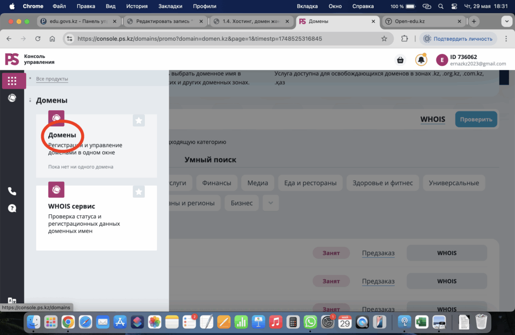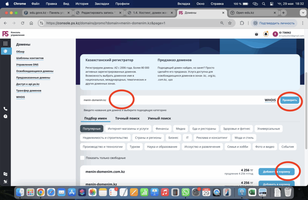 - Поиск деген өріске өзіңіз ойлаған домен атын жазыңыз және проверить батырмасын басыңыз