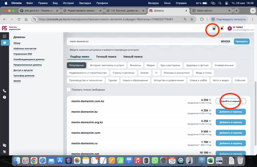 - Бос домен болса жанына добавить в корзину дегенді басасыз егер домен бос болмаза занят деген сөз турады.