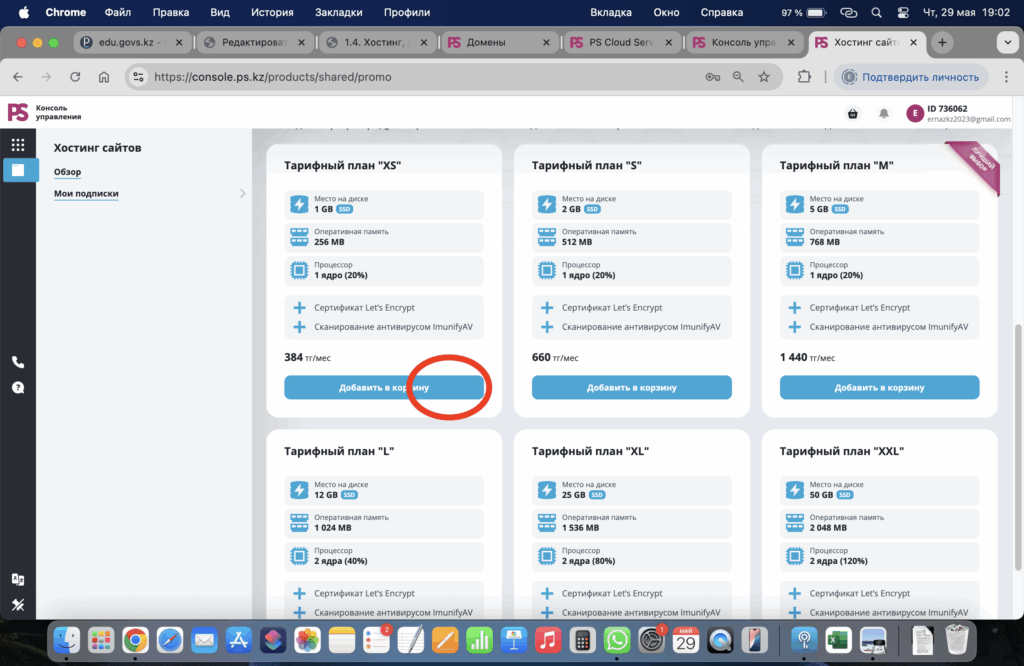 - осы бөлімнен сіз хостинг көлемі, жедел жады және ядросына қарай бірнеше тарифтік жоспарды байқадыңыз. қолданатын сайт көлемі мен сайтты пайдаланатын сайт қолданушыларының санына қарай тиімді тарифті таңдап, Добавить в корзину батырмасын басыңыз,