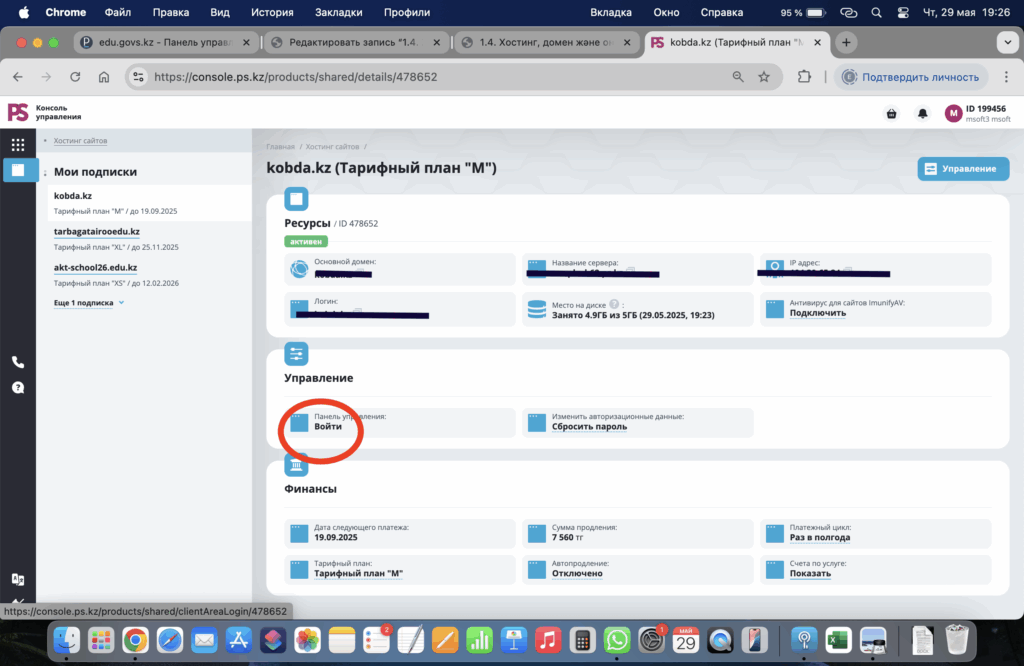 - Войти батырмасын басу арқылы сіз хостингті басқару тақтасына өтесіз