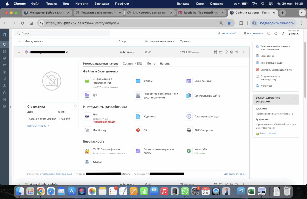 Хостинг басқару тақтасындағы орналасқан бөлімдер мен элементтерге кіріп көріңіз